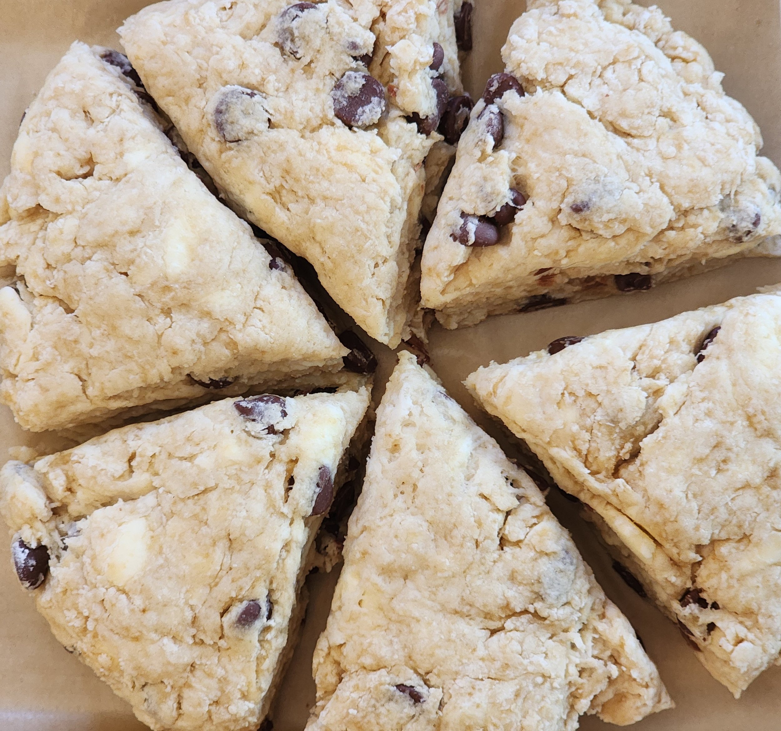 • While oven is pre-heating, remove scones from plastic and place evenly-spaced on parchment-lined baking tray